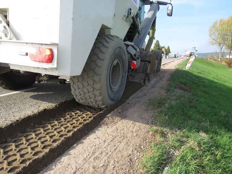 Door de werkgangen te combineren in één machine, die per keer ook nog meer werk kan verzetten, vermindert Terrastab het aantal transportbewegingen en daarmee de schadelijke uitstoot. 'En als je voor het voertuig ook nog een alternatieve diesel zoals HVO100 gebruikt, kun je nóg een stap zetten', aldus de directeur. Verder wordt het aantal transportbewegingen gedrukt door zoveel mogelijk bestaand materiaal te hergebruiken. Zo hoeft er immers geen grondmateriaal afgevoerd, aangeschaft of aangevoerd te worden. Bunt: 'Wij gebruiken het materiaal dat op de locatie aanwezig is. Ligt er bijvoorbeeld al een stukje asfalt, dan frezen we het kapot (mits er geen teer in zit) en gebruiken we het als basis voor de nieuwe ondergrond. Maar ook ander materiaal, zoals puin, zand, schelpen of gewoon grond kunnen we gebruiken.'