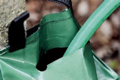 De helling langs de snelweg brengt uitdagingen met zich mee voor de jonge aanplant. Door de zwaartekracht verdwijnt het gevallen regenwater vrij snel door de schuine standplaats. Gietranden zijn er niet zomaar te installeren. Voor dit soort situaties ontwikkelde Greenmax de Aquabag, een relatief grote groene druppelzak, waarmee gefaseerd en gericht water rond de stam van de boom wordt toegediend. 'Het is een eenvoudige, betaalbare technologie, waarbij geen ondergronds irrigatiesysteem nodig is', zegt van Pinxteren. 'Ook kun je de zak er zo omheen hangen. Nadat je de Aquabag hebt afgevuld, druppelt het water zes tot tien uur lang langs de stam van de boom. Hierdoor bevorder je diepe wortelgroei.'