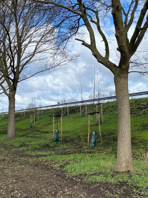 De uitdagende standplaats was voor Heijmans reden om te verkennen hoe aan de waterbehoefte van de jonge aanplant kon worden voldaan. 'Onze keuze viel op Aquabags, omdat delen van de taluds moeilijk begaanbaar en bomen moeilijk bereikbaar zijn voor het geven van water', legt Maarten van Dijck van Heijmans uit. 'De druppelzakken die aan de boom hangen, zijn gevuld met 75 liter water. In totaal worden er 2000 Aquabags opgehangen, en 1000 gietranden geplaatst bij bomen waar dat wel kan. Op die manier krijgen de jonge bomen voldoende water om goed te kunnen groeien.'