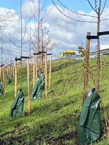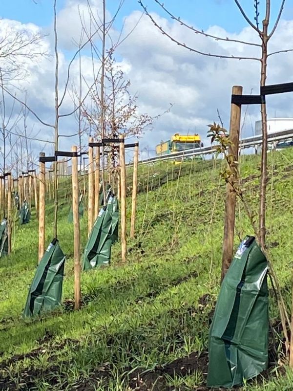 Bij jonge aanplant is het heel belangrijk dat de boom snel en goed aanslaat op zijn nieuwe groeiplaats. Te weinig watertoevoer leidt er al snel toe dat de plant verdroogt en dus een sterft. Langs de A1 zijn onlangs 2000 Aquabags aangebracht bij jong aangeplante bomen op het talud. De grote groene druppelzak, een initiatief van Greenmax, moet zorgen voor een gefaseerde en gerichte watertoevoer. 'Hierdoor voorkom je dat het water wegloopt. Daarnaast krijgt de boom rustig de tijd om het water op te nemen', aldus Patrick van Pinxteren van Greenmax.