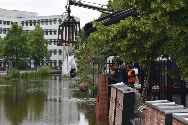 Voor de bomen moest een groeiplaats ontwikkeld worden tussen de betonelementen en de stalen damwand. Erwin van Herwijnen, groeiplaats specialist bij Tree Ground Solutions, is een van de specialisten die aan dit onderzoek deelneemt. Hij begint bij de basis: 'De juiste groeiplaats voor bomen voldoet aan drie essentiële voorwaarden, voldoende toevoer van vocht, zuurstof en voeding. Omdat de bomen worden geplaatst in een kleine en bijna afgesloten groeiplaats moesten we een substraat toepassen dat ervoor zorgt dat er steeds vocht, zuurstof en voeding beschikbaar is.' De bomen in de proefopstellingen staan nu in twee typen substraat, één op basis van een lavazand en de ander op basis van capillair zand. Van Herwijnen: 'We zoeken hier de balans tussen het aandeel water en zuurstof in de leeflaag van de wortels. Belangrijk om te weten is dat de groeiplaats altijd vanuit de Nieuwe Mark gevoed wordt en dat de capillariteit van het product bepalend is voor de kwaliteit van de groeiplaats. Daarnaast moeten we voldoende stabiele organische stof meegeven zodat de beplanting zich positief en duurzaam kan ontwikkelen.' Een keuze is er nog niet gemaakt, omdat beide substraten goed presteren. Hij is tevreden met het resultaat tot nu toe: 'Het is wel duidelijk wat het stedelijk klimaat voor invloed op de beplanting heeft, bij de start van het project heeft de reflectie van de muur ervoor gezorgd dat de beplanting aan de noordzijde (lees zon van de zuidzijde) veel te lijden heeft gehad van de warmte die van de muur afkwam. Toch mooi om te zien hoe flexibel de natuur kan zijn, want de bomen hebben zich weer hersteld.'