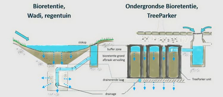 Het ondergrondse bioretentiesysteem van TreeBuilders heeft beide functies: bioretentie en ondergrondse waterberging. Het is een 'ondergedompelde' regentuin, bestaande uit modulaire eenheden met grond erin, om de boomgroei te ondersteunen en ter plaatse een krachtige regenwaterhuishouding te creëren door absorptie, verdamping, onderschepping en filtratie, zonder extra ruimte in te nemen in het drukke stadsgebied.