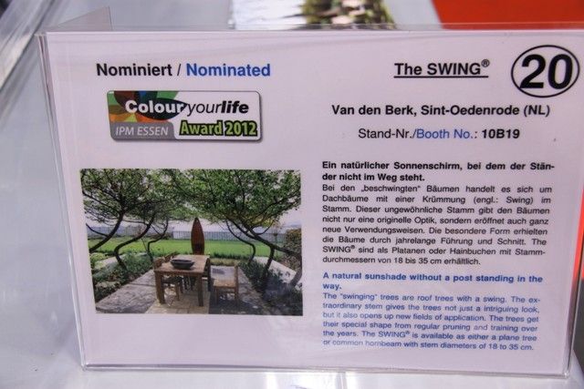 Tijdens IPM 2012 streden twintig genomineerden om de 'Colour your Life Award 2012'. Van den Berk Boomkwekerijen uit Sint-Oederode won met de inzending The Swing, een samenwerkingsproduct met Van Roessel Vormbomen (Berkel-Enschot). Onderstaand de prijsuitreiking in beeld, met alle Nederlandse genomineerden.