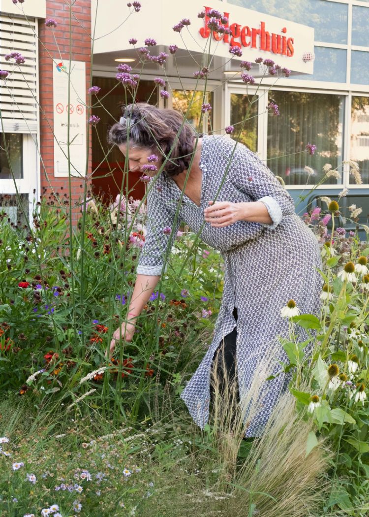 In het voorjaar van 2020 bracht Snoek Puur Groen een prairietuin aan op het parkeerterrein van het Jelgerhuis in Leeuwarden. De kleurrijke border grenst aan de behandelruimte van beeldend therapeut Herma Betten, die de tuin gebruikt bij haar therapieën.