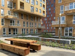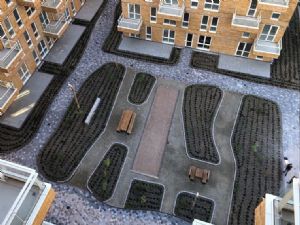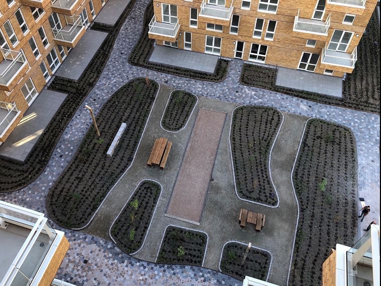 De daktuin tussen The Grid en The Row is voorzien van zitelementen met in het middelpunt een kunstwerk met een hangende stoel. Tussen The Line en The Wave is de beleving van de daktuin robuuster, met tussen de groenvakken rotsblokken, grindpaden en lichtelementen. De daktuinen zijn gerealiseerd op de daken van de parkeergarages van de bewoners. Onder het substraat bevindt zich een retentielaag die water bergt voor de drogere perioden in het jaar. Langs het gebouw is een infiltratiesysteem aangelegd. Hiermee kunnen regenbuien van 60 mm per uur kunnen worden opgeslagen en vertraagd aan de omgeving worden afgegeven. Dit alles conform de norm "Rainproof" van gemeente Amsterdam.