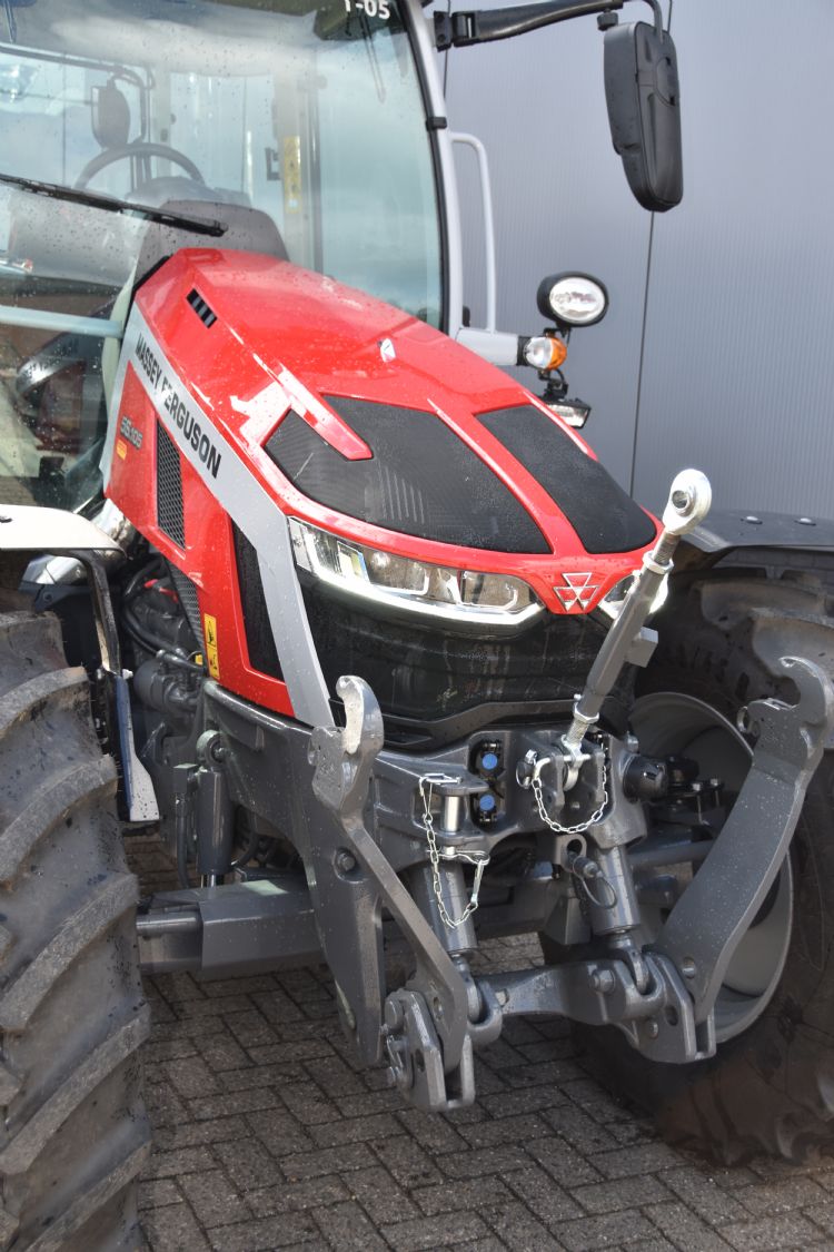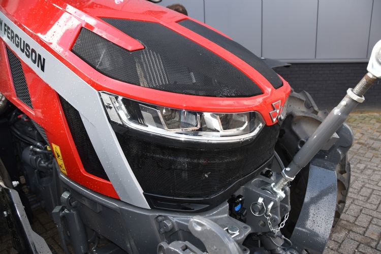 Ook de voorkant van de tractor heeft de nodige veranderingen ondergaan. Het fraaie, smalle design en de schuin aflopende motorkap zijn nieuw. Dit geeft vanuit de cabine een beter zicht op wat zich voor de tractor afspeelt. Dick van Breda erkent dat dit vooral het gemak bij het werken met een frontmaaier ten goede komt: 'Maar dit geeft de MF 5S optisch natuurlijk ook een veel moderne uitstraling, en dat was nodig. De tractor heeft moderne koplampen gekregen met een ledsignatuur. De striping, de stijlen van de cabine en de velgen die voorheen zwart gespoten waren, zijn "neo-retrogrijs" van kleur geworden.' Iets anders is de doorontwikkeling van de vooras. De geveerde vooras kan nu tot 900 kilo zwaarder belast worden. Van Breda: 'Deze nieuwe, brede vooras heeft een grote stuuruitslag, wat de tractor zeer wendbaar maakt.'