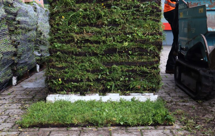 Wie grasmatten kan leggen, kan ook de wildebloemenmatten leggen. Er is weinig verschil. Dezelfde regels gelden. Schone, vlakke en losgemaakte grond is belangrijk, evenals goed contact tussen de mat en de ondergrond direct na aanleg. De matten worden plat op pallets geleverd, zijn 100 x 50 cm groot, 3 tot 5 cm dik, en kunnen net als grasmatten op maat afgesneden worden. De aanleg kan jaarrond plaatsvinden, behalve bij vorst of extreme droogte. De eerste weken na aanleg moet de ondergrond vochtig gehouden worden, totdat alle plantensoorten zich geworteld hebben. Productmanager Buddy Wijnands licht dit toe: 'Zeker de eerste twee weken na aanleg is het van belang dat 5 tot 10 cm van de aangelegde toplaag vochtig is, zodat de wortels vanuit de Urban Meadow hier goed in door kunnen dringen. Mijn ervaring is dat de gelegde matten zich na deze periode zeer goed aan de ondergrond hebben gehecht. Uitdroging moet je in deze fase voorkomen, zodat de planten in deze kritische periode geen stress ervaren.'