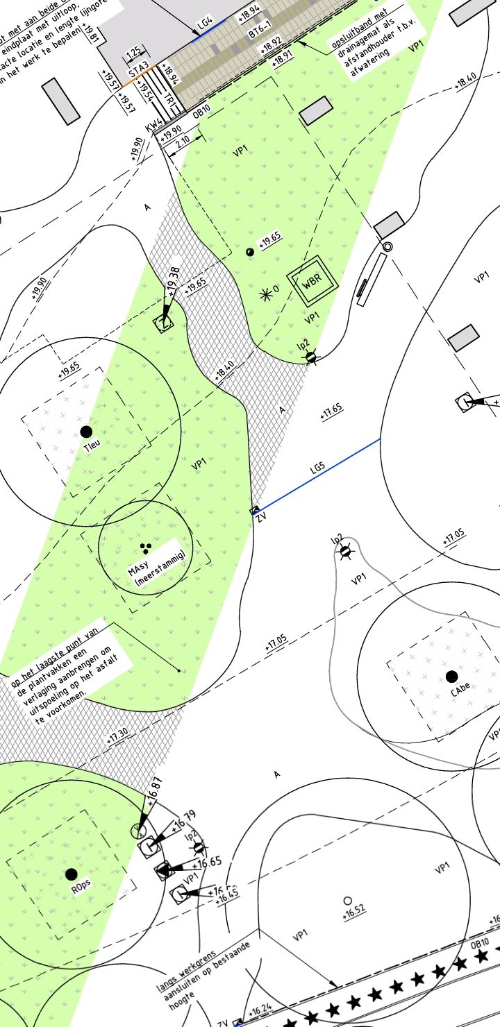 De bomen komen op kleine terpen te staan of, waar dat kon, in verlagingen boven de kolommen van de bouwkundige constructie eronder. Smitsrinsma heeft de berekeningen verzorgd, samen met de constructeur van de woningen, constructeur Zonneveld. Stevens: 'Tijdens het hele traject hebben wij continu contact met de architecten, constructeur en installateurs om zeker te zijn dat alle uitgangspunten kloppend blijven. De afstemming vond plaats in de bouwkeet of via Teams. Er is voor het creëren van de plaatsen en de route voor de toekomstige telekraan heel wat afstemming geweest.'