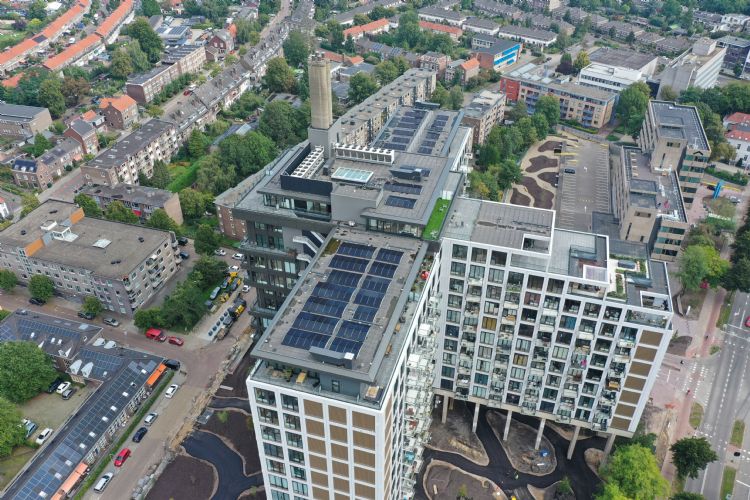 Het kolossale kruisvormige gebouw is dus geen nieuwbouw. 'Dat is het bijzondere aan dit project', vertelt Stevens. 'Het gebouw is volledig ontmanteld, tot op de constructieve binnenste schil. Het gebouw bestaat nu uit 281 appartementen, verdeeld over twaalf verdiepingen. De woningvormen verschillen van sociale huur tot penthouses meer dan een miljoen euro.'