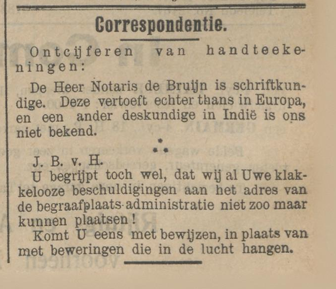 begraafplaatsadministratie publiekelijk te delen. Zo stond er op 15 mei 1914 in ‘Het nieuws van den dag voor Nederlandsch-Indië’ te lezen: ‘U begrijpt toch wel, dat wij al Uwe klakkelooze beschuldigingen aan het adres van de begraafplaats-administratie niet zoo maar kunnen plaatsen! Komt U eens met bewijzen, in plaats van met beweringen die in de lucht hangen.’ Bron: Het nieuws van den dag voor Nederlandsch-Indië, 15-05-1914