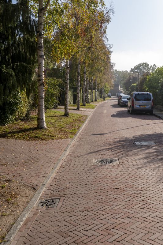 Er waren voor Steffenskamp meerdere afkoppelsystemen mogelijk. Om de keuze overzichtelijk te houden, zijn er drie afkoppeloplossingen bepaald en voorgelegd aan de bewoners. Keuze 1: meanderende drainslang De eerste maatregel was het aanleggen van een drainslang die aan de onderkant van de regenpijp wordt aangelegd en vervolgens meanderend door de tuin loopt en de tuin kan bewateren. Keuze 2: hemelwaterafvoer via de Well-O-Edge Cas: 'Voor tuinen die moeilijk doordringbaar zijn, hadden we de oplossing om vanuit de regenpijp direct ondergronds te gaan met een geperforeerde buis van 24 mm. Die leggen we ondergronds aan tot de rand van het perceel. Aan die rand van het perceel installeren we vervolgens de Well-O-Edge, een uitstroomtegel van Struyk Verwo Infra. Via de Well-O-Edge loopt het hemelwater over het trottoir naar de straat. Het is niet wenselijk dat bij het minste of geringste regenbuitje de Well-O-Edge gaat stuwen, want dan krijg je mosvorming en gladheid op de stoep. Daarom hebben we het systeem zo gedimensioneerd, dat de buis bij normale regenbuien het water afgeeft in de grond en dat bij de extreme buien in Laren - volgens berekeningen is dit eens in de twee jaar - het water via de Well-O-Edge naar het nieuwe hemelwaterriool wordt afgevoerd. Goede eigenschappen van de Well-O-Edge zijn dat deze heel praktisch is en er esthetisch gezien mooi vlak en strak uitziet. Het past in het straatbeeld van Laren waar je veel heggetjes, inritten en beplanting op de percelen ziet. Omdat de Well-OEdge ook compacter is, kun je met dit systeem op kleinere locaties hetzelfde resultaat bereiken.' Keuze 3: aanleg van een infiltratiekolk De derde maatregel is hetzelfde principe als de Well-O-Edge, maar dan wordt er gebruik gemaakt van een infiltratiekolk die uitkomt aan de rand van het perceel. De infiltratiekolk is groter en grover ten opzichte van de Well-O-Edge en heeft wat meer ruimte nodig.