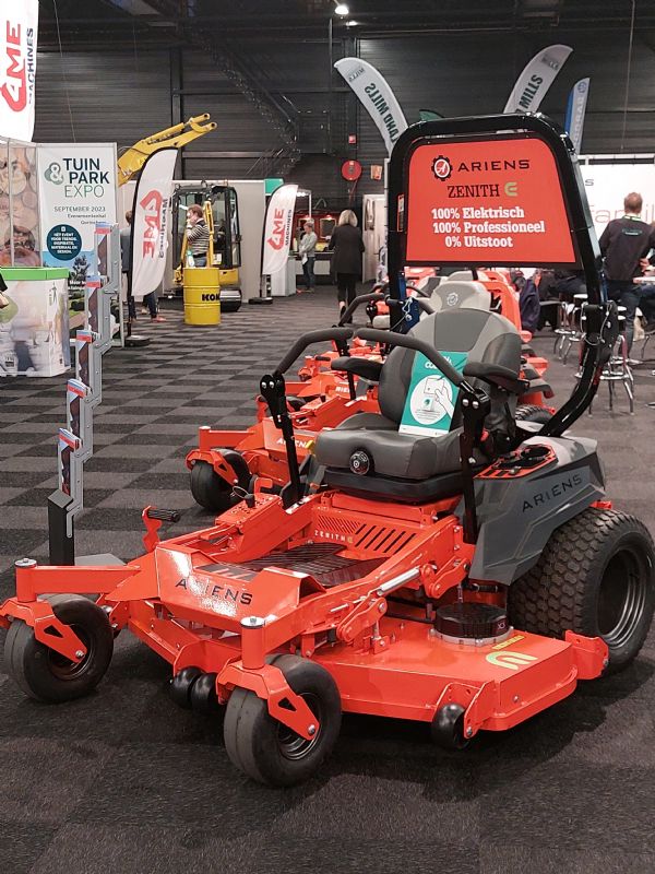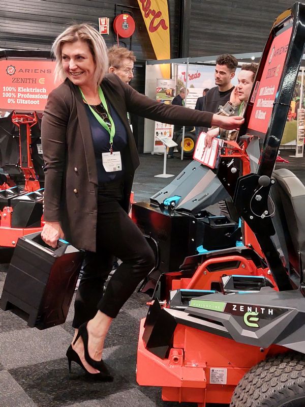 De grote trots in de stand van Helthuis Tuin- en Parkmachines was de elektrische Ariens Zenith-zeroturnmaaier, beschikbaar in Nederland sinds begin 2021. Kathy Sevcikova van Helthuis vertelde over de grote interesse uit de markt voor de machine.