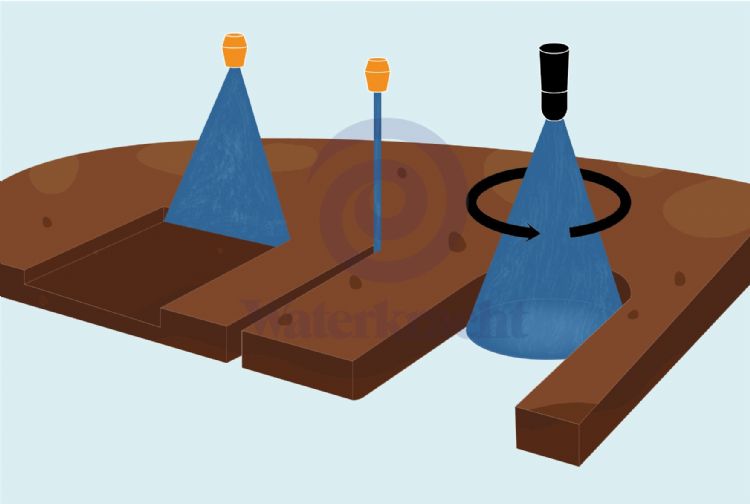 Met een vlakstraalnozzle verlaag je de plaatselijke impact; hoe breder de straal, hoe lager de impact. Daarom kun je vaak kiezen uit vlakstraalnozzles met een spuithoek van 15, 25, 30 of 65 graden. Meestal kiest men voor een spuithoek van 15 of 25 graden. Het gebrek aan kracht van een vlakstraalnozzle kun je compenseren door hogere druk of meer water. En dan is er ook nog de vuilfrees. Dit is niets anders dan een puntstraalnozzle die roteert. Hoe hoger de druk, hoe meer rotaties en hoe sneller hij werkt. Ze zijn populair bij de minder krachtige hobbyreinigers, maar voor professioneel gebruik zijn ze er ook. Zoals ik al vertelde, moeten we met geconcentreerde puntstralen voorzichtig omgaan. Dat geldt ook voor deze priemende, roterende puntstraal. Voor je het weet, is het oppervlak van een hekwerk, straatmeubilair, betontegels of klinkers beschadigd. Dan worden ze poreus, waardoor algen en mossen zich er gemakkelijker op kunnen vestigen. Alleen zeer harde oppervlakken komen in aanmerking voor gebruik van de vuilfrees. Behalve als het oppervlak bewust beschadigd moet worden, bijvoorbeeld bij het opruwen van een vloer voordat je er een nieuwe coating op aanbrengt.