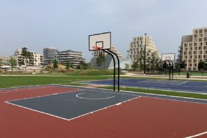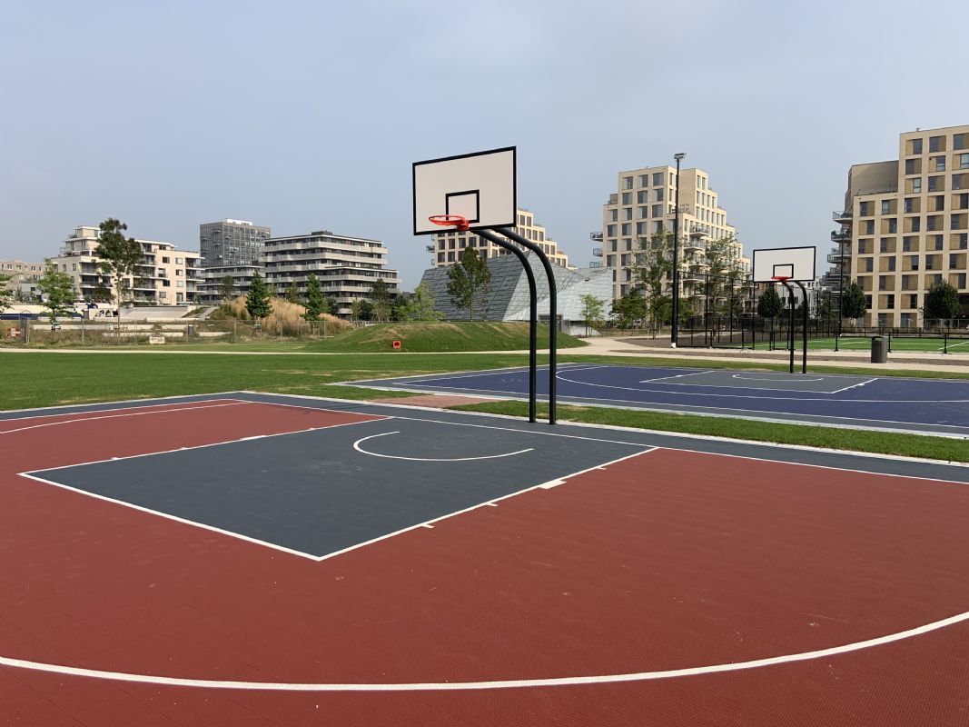 Modulaire sportvloeren in Amsterdam-Zuidoost (links) en de Sportveldenbuurt, eveneens in Amsterdam (rechts)