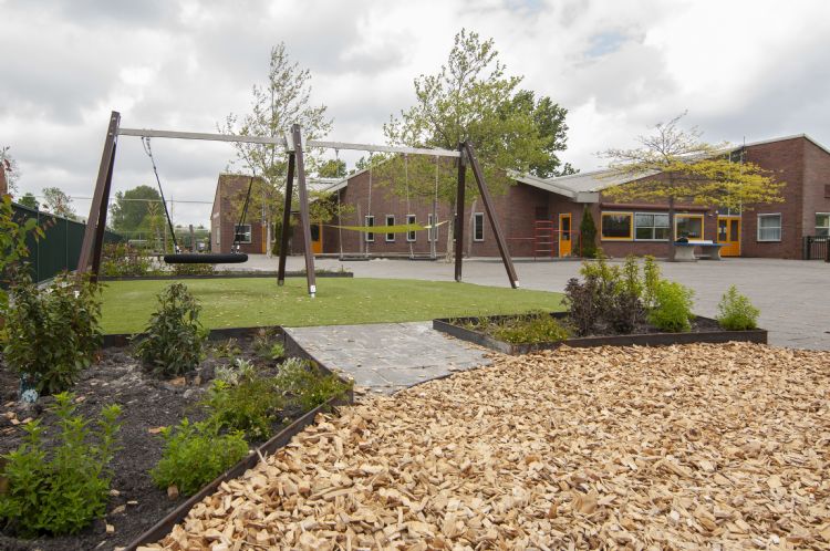| De Gerardus Majellaschool in Onderdijk: rondom de speeltoestellen is ruimte voor veel groen. |