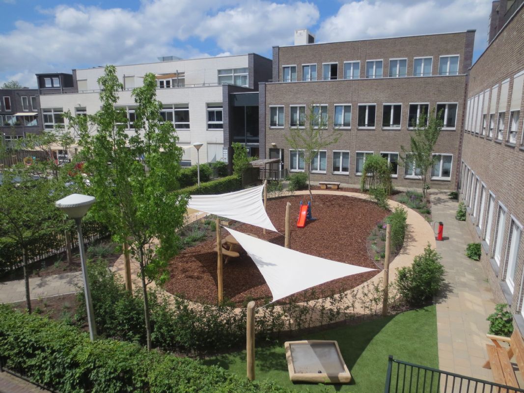 Bijzonder aan het project is dat er verscheidene materialen duurzaam hergebruikt zijn. Zo zijn de 30×30 tegels hergebruikt voor het glazenwasserspad langs het gebouw. Ook de al aanwezige hagen en bomen zijn behouden gebleven om zo mooie, groene speelplaats te creëren.