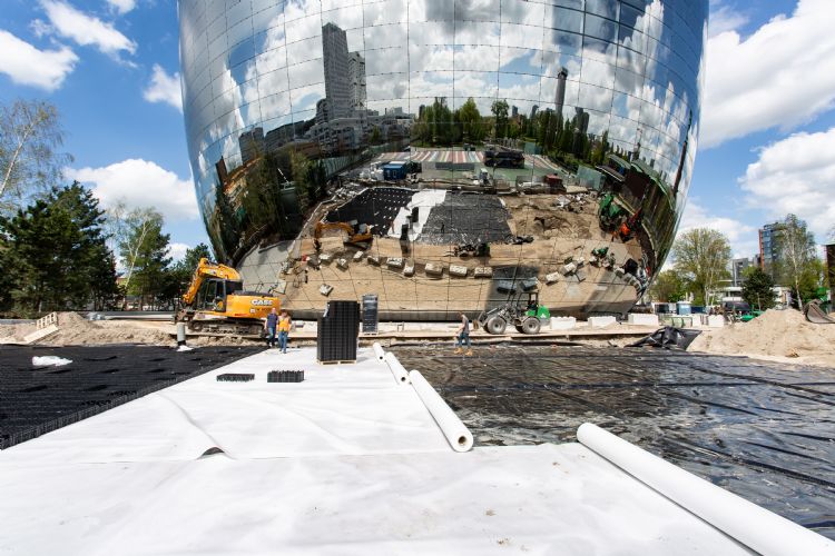 Voor de ophoging op het dak van de parkeergarage die dient als toegang tot het park, maar ook voor de broodnodige waterberging, kwam Joosten Ecodak in actie. Er werden EPS150-blokken geleverd, gewapend Nicotarp-folie om het EPS (piepschuim) te beschermen en voor erbovenop Tensar-wapening. De volgende laag, onder de bestrating, was een menggranulaat.