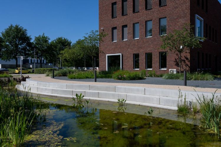 Bij Driessen Groep staan mensgerichte innovatie en werkgeluk hoog in het vaandel. Zo vertelt Marije de Greef, directeur van de Brainport Human Campus: 'Samen gave dingen doen die er toe doen, zo kijken wij naar werkgeluk. En met name dat je samen met je collega's en met klanten op een fijne manier samen kunt komen. Dat vertaalt zich op de campus in ontmoetingsplaatsen met daaromheen de werkpanden.' Het terrein moest daarnaast voor veel verschillende gelegenheden geschikt zijn. Daarbij heeft MBI o.a. maatwerk betonelementen en bestrating geleverd: 'We hebben ook op het plein permanente ontmoetingsplekken gemaakt met de betonelementen waar mensen kunnen zitten aan het water of bij de bomen. Wij geloven ook sterk in evenementen organiseren om mensen te inspireren, daarvoor kunnen we heel het terrein omtoveren. Zo hebben we ook podia gerealiseerd en foodtrucks kunnen direct het terrein oprijden. Daar is in de bestrating ook rekening mee gehouden', aldus de Greef.