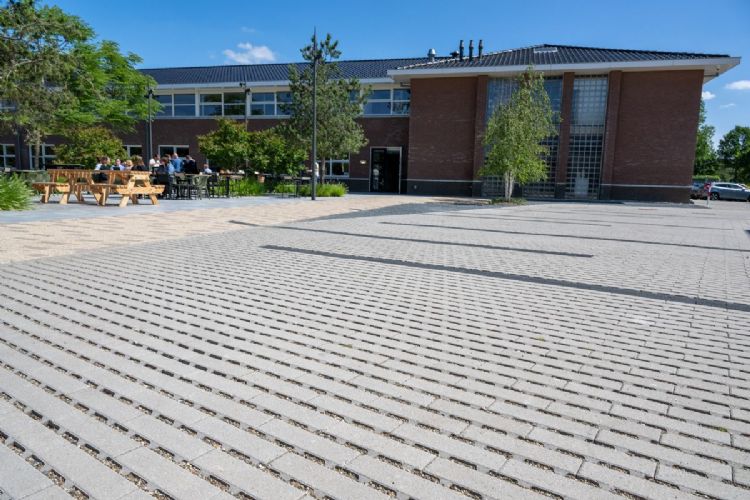 Naast de multifunctionaliteit en beleving, was er voor de campus een hoge groenambitie vanuit zowel opdrachtgever als architect. De hoge groenambitie is ook duidelijk terug te zien in de materiaalkeuzes: 'Met MBI hebben we ervoor gekozen om de natuur toe te voegen aan de bestrating. Een eenvoudige manier om dat te doen is om aardtinten toe te voegen. Maar we zijn nog een stap verder gegaan. De toplagen van de stenen op het looppad zijn bijvoorbeeld gemaakt van strand zandgrond tot aan bosgrond. We hebben daarvoor naar de genius loci oftewel 'de geest van de plek' gekeken, in dit geval Helmond. Wat vertelt dat? Daar hebben we die toplagen door laten inspireren. MBI is daar heel erg meedenkend in geweest', aldus Buijtels. Ook wordt op het campusterrein de ruimte geboden aan water met het idee dat (hemel)water kan infiltreren op de plek waar het valt. Daarvoor is waterpasserende bestrating van MBI toegepast. Buijtels: 'Het hoofdpad is waterdoorlatend. We hebben daarnaast gebruik gemaakt van halfverharding Olivijn. Dat is een CO2 opruimend gesteente. Op het hele terrein is daarmee waterafvoer overbodig geworden, want het hele terrein watert af op zichzelf. Het terrein is tegelijk bestand tegen zwaar verkeer dankzij de waterpasserende bestrating. En dat is uniek.'
