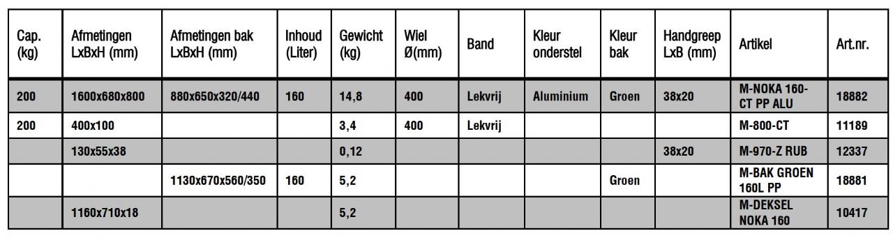 De Noka 160-CT WB heeft een lekvrije band, die opgebouwd is uit opgeschuimd polyurethaan. De stalen velgen en de dubbele, gesloten kogellagers stralen de professionaliteit uit die je verwacht bij dit onmisbare hulpmiddel voor de hovenier. Het frame bestaat uit ovale en ronde buizen van met magnesium versterkt aluminium. Die maken de kruiwagen sterker en lichter. De natuurrubberen handgrepen zijn ergonomisch en naar de hand gevormd en hebben een knokkelbescherming. Voor extra veiligheid zijn ze aan de achterzijde open gelaten. Om slijtage aan de voorzijde van de bak te voorkomen en hem extra te beschermen, is een aluminium framebuis toegepast die de contouren van de bak volgt. Verder heeft de kunststof bak rondom een kraalrand. Deze beperkt de slijtage van de bak bij het rechtop zetten en het leegstorten van de kruiwagen. Zoals gebruikelijk verlengen stevige rvs-slijtsloffen de levensduur van de twee ondersteunende poten.
