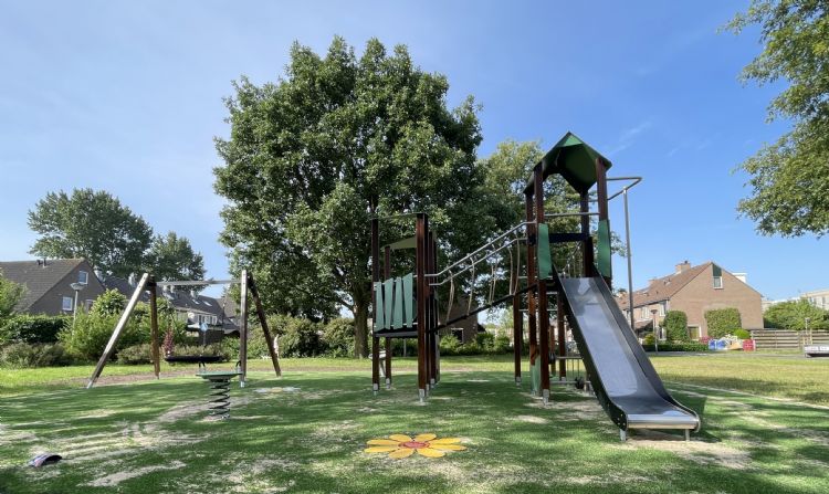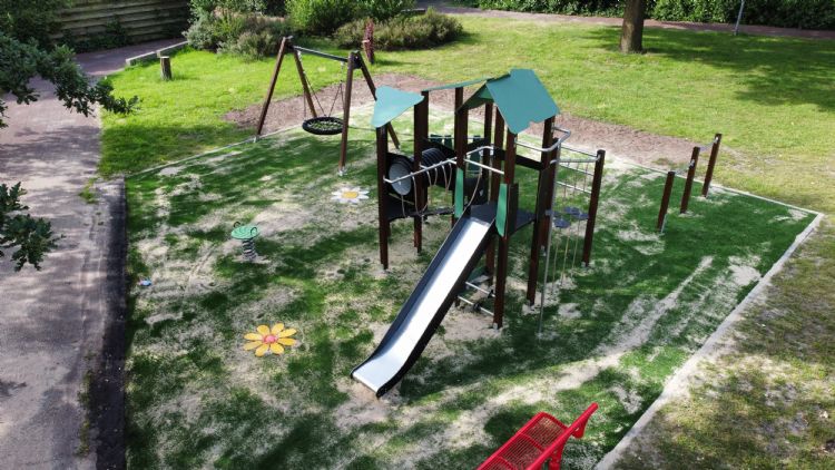 De gloednieuwe speelplek is voorzien van een combinatietoestel met drie torens, een tweevoudig duikelrek, een vogelnestschommel, een draaikuip en een veerwip. Het groene valgras met een drietal ingelegde bloemen zorgt voor een gezellig geheel én maakt natuurlijk dat er veilig gespeeld kan worden. 'Het resultaat is een mooie speelplek met vertier voor alle kinderen uit de buurt', vertelt John Bakker, mede-eigenaar Hercules Speeltoestellen.