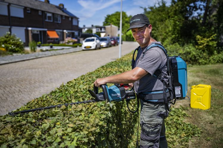 'In de tuin- en parksector wordt traditioneel nog veel met brandstofmachines gewerkt. Sandee Groep wilde de overstap maken naar meer elektrisch', vertelt Arjen Peeters van Makita. 'Tweetakt en andere brandstof zijn arbo-technisch niet meer verantwoord. Het is de bedoeling dat je zo schoon mogelijk werkt. Ook in aanbestedingen worden steeds meer uitstootloze producten geëist. Via een van onze dealers hoorden we dat Sandee de stap wilde zetten naar accugereedschap, maar onzeker was over de juiste machines voor hun werkzaamheden. Voor dit soort vragen hebben wij drie technische adviseurs op de weg. Ruud Steenbakkers reed met zijn demobus naar Sandee en liet daar na een inventarisatie een aantal machines en gereedschappen achter, die de medewerkers een paar weken konden gebruiken en uittesten. De aankoop gaat vervolgens via de dealer.'