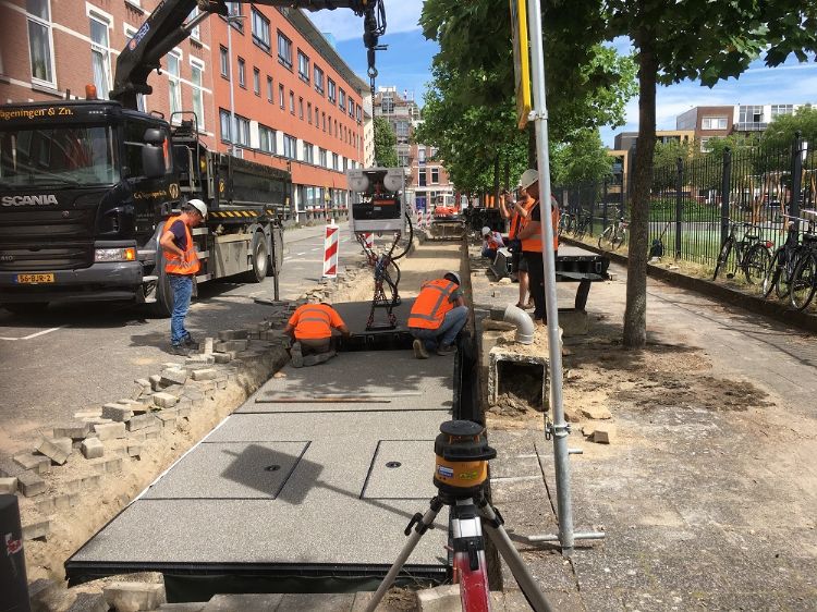 Wat zijn die voordelen dan precies? Allereerst is het product gemaakt van gerecycled plastic, wat helemaal past in de visie van een circulair wegsysteem. Daarnaast zijn de plastic elementen hol vanbinnen, wat om meerdere redenen handig is. Oostra: 'Zo kan er water onder het wegdek stromen, waar zich flink wat bergingsruimte bevindt. Water kan zich daar verzamelen en zo de ondergrond in stromen. Dat is ook goed voor de bomen.' Een ander voordeel is dat het systeem modulair is. Daardoor kun je de onderdelen niet alleen snel leggen, maar ook zo weer weghalen en ergens anders neerleggen. 'Dat is het leuke aan dit concept', vindt Oostra. 'Zo zou je een weg tijdelijk kunnen aanleggen. Dan kun je kijken of het werkt en eventueel besluiten om toch wat anders te doen.'
