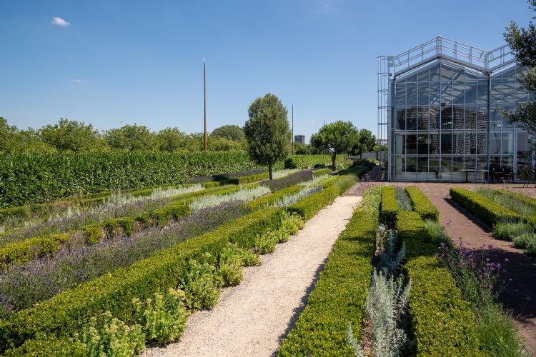 | | Het hart van het dakpark bestaat uit een grote kas, de Orangerie, waarin horeca is gevestigd |