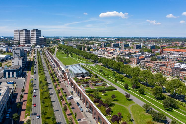 Tuinontwerper Cor van Gelderen van Plantentuin Esveld in Boskoop voorzag het project van plantadvies, waarbij de plaatsing van meerstammige bomen van boomkwekerij Ebben een van de uitgangspunten in het ontwerp vormden. Op het dak is een grondlaag van 1,5 meter dikte aangebracht, waarin staalmatten zijn verwerkt die ervoor zorgen dat de bomen extra verankerd zijn. 'Het was belangrijk dat de beplanting bijdraagt aan de biodiversiteit en daar is dus ook nadrukkelijk rekening mee gehouden', vertelt Van Gelderen. 'Daarnaast ben ik uitgegaan van soorten die tegen een stootje kunnen.'