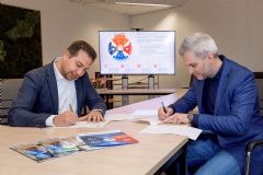 | Vanaf 8 december 2022 kunnen VHG-leden bij hun aanbestedingen tegen een gereduceerd tarief gebruik maken van de Altura-app. Matthijs Huiskamp (Altura) en Richard Maaskant (plaatsvervangend directeur VHG) starten de samenwerking met de ondertekening van de samenwerkingsovereenkomst. |