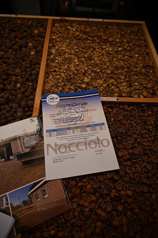 Vergeet die rubbermatten en boomschors bij speeltoestellen maar. Onlangs heeft Nocciolo een certificering ontvangen vanwege de valdempende werking van een paar producten. De perzik- en abrikozenstenen van Nocciolo blijken namelijk zeer geschikt als ondergrond bij speelplekken. De stenen ogen heel natuurlijk en zijn goedkoper in aanleg. Maar belangrijker nog; de stenen hebben een ongekende valdemping.