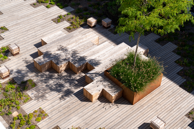 De daktuin is opgedeeld in verschillende hoogtes, waarbij heuvels zijn gemaakt van daktuinsubstraat met daaronder EPS-platen om gewicht te besparen. 'Juist bij het realiseren van een daktuin moet je er heel erg rekening mee houden dat de elementen niet te zwaar worden', licht Van Haren toe. 'Gelukkig hadden wij daar bij dit project geen problemen mee.' Voor de aankleding van de daktuin is flink geïnvesteerd in groen door de toevoeging van plantenbakken en beplanting. Zo zijn er vaste planten en niet-woekerende bamboesoorten toegepast op de heuvels. Voor de plantenbakken is een mix van sedum, kruiden en grassen gekozen en zelfs twee bomen, om precies te zijn Gleditsia. Het is de bedoeling dat de bewoners dit groen zelf gaan onderhouden. Van Haren: 'De opzet van de daktuin is zo dat bewoners zowel beschikken over een eigen terras als over een gezamenlijke binnentuin. In het midden van deze binnentuin bevinden zich ook de verhoogde zitelementen.'