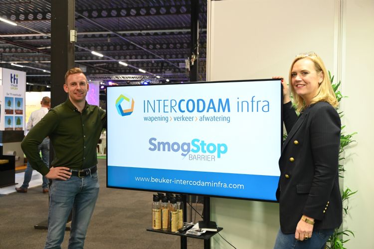 Op de stand bij Intercodam Infra een primeur. De lancering van de SmogStop barrier, een speciaal ontworpen scherm dat schadelijke NOx stikstofverbindingen door fotocatolyse weer omzet in N2 en O2 gassen. Het bedrijf belooft een gemiddelde stikstof reductie van 50% ten opzichte van andere maatregelen. Henk Stunnenberg en Birgit Schmeing hadden zelfs Caroline van der Plas uitgenodigd naar de beurslancering, maar die was helaas te druk met het landbouwdebat. Schmeing: 'Het systeem is getest door de Universiteit van Toronto, het gaat dus nadrukkelijk niet om een pilot of testproduct. Het is een bewezen techniek.'