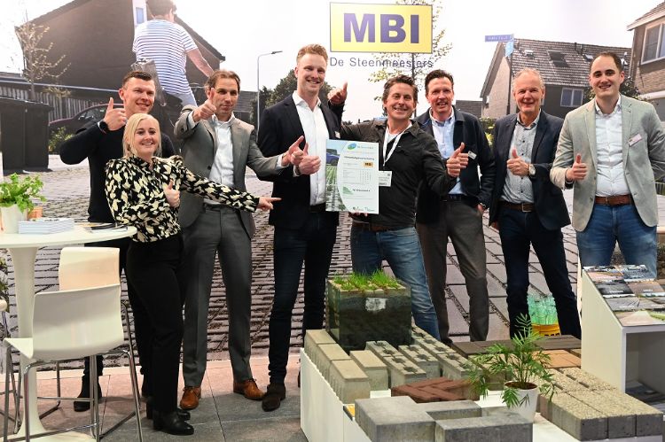 Bij MBI spotten we een primeur op de stand. Vers van de pers ligt er een nieuw waterpasserend dikformaat. Tijdens de eerste beursdag kreeg MBI uit handen van Lodewijk Hoekstra een gloednieuw productlabel voor hun nieuwe steen. De nieuwe klimaatadaptieve bestrating is een A-label bij NL Greenlabel. Roy Oosthoek van MBI: 'De nieuwe steen is in iedere kleur leverbaar.'