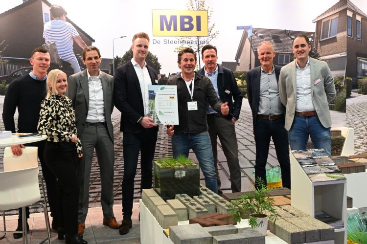 De nieuwe dikformaatbestrating heeft kleine openingen langs de rand, waarlangs het water kan infiltreren. Vertegenwoordiger Roy Oosthoek van MBI laat weten dat de nieuwe steen in iedere kleur leverbaar is. Op de eerste beursdag ontving Oosthoek van MBI de Steenmeesters een label uit handen van Lodewijk Hoekstra van NL Greenlabel. De nieuwe klimaatadaptieve bestrating kreeg een A-label.