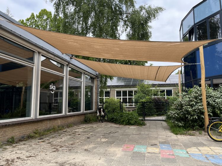 Omdat het gebouw een plat dak heeft bleef in het verleden de warmte behoorlijk lang in de leslokalen hangen. ZONZ plaatste eerder op deze plek al een schaduwdoek, maar dan aan palen om schaduw op het speelgedeelte te krijgen. De huidige doeken beginnen direct aan de gevel. Door de maatregel heeft SKA minder last van hoge temperaturen en gevaarlijke uv-straling.