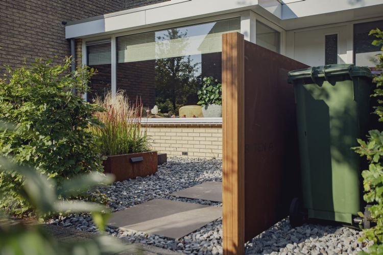 De tuin is onderhoudsvriendelijk opgezet. Er zijn drie verhoogde bakken geplaatst, twee van cortenstaal en een exemplaar van antracietkleurige stapelblokken. Het pad naar de voordeur wordt gevormd door Geoceramica-tegels van 80 bij 80 cm met eromheen basaltsplit. Rondom de tuin is ter afscheiding een haagbeuk geplant. Om de vuilnisbakken uit het zicht te plaatsen, is er gebruikgemaakt van de verlichting van in-lite.