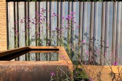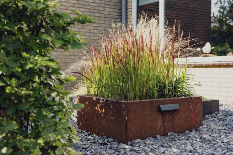 Cortenstalen plantenbakken geven tuin een warme uitstraling |