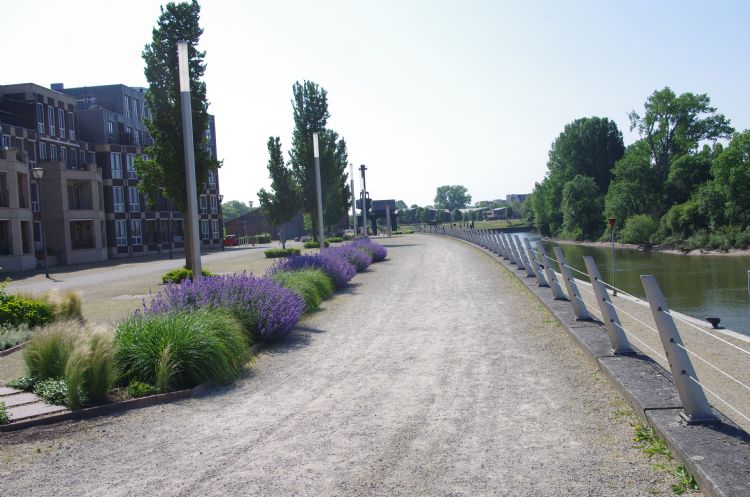 Kenmerkend voor het landschap is de scherpe overgang van natuur naar bebouwing. 'We hebben er nadrukkelijk op gestuurd om die overgang te verzachten,' zegt Moors daarover. 'Dat zie je in het macro-ontwerp, in de wijze waarop de plantvakken de vormen van de rivier volgen, maar ook in meer detail, door de randen van de plantvakken te verzachten. Veel begroeiing hangt over de randen, waardoor de overgangen van plantvak naar halfverharding minder scherp wordt.'