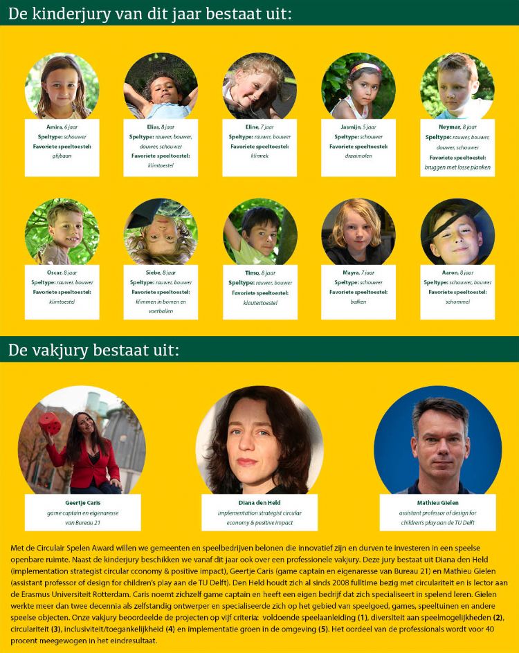 Enthousiaste jury (jong en oud) buigt zich over vijf nominaties Wat is de leukste en meeste bijzondere circulaire speeltuin van dit jaar? Over deze vraag bogen onze kinderjury en onze kersverse vakjuryleden zich tijdens het boordelen van de vijf nominaties. Opvallend was dat onze jongste experts vooral op zoek waren naar spanning, uitdaging en mogelijkheden om te klimmen en klauteren. De vakjury concentreerde zich meer op de technische en circulaire details. Op deze manier kwam een weloverwogen eindoordeel tot stand vanuit diverse gezichtspunten. In dit artikel volgt een uiteenzetting van de nominaties, waarbij delen van het jurycommentaar worden onthuld. Wie de Circulair Spelen Award wint, zal spoedig bekend worden gemaakt via onze website en in de volgende editie van dit vakblad.