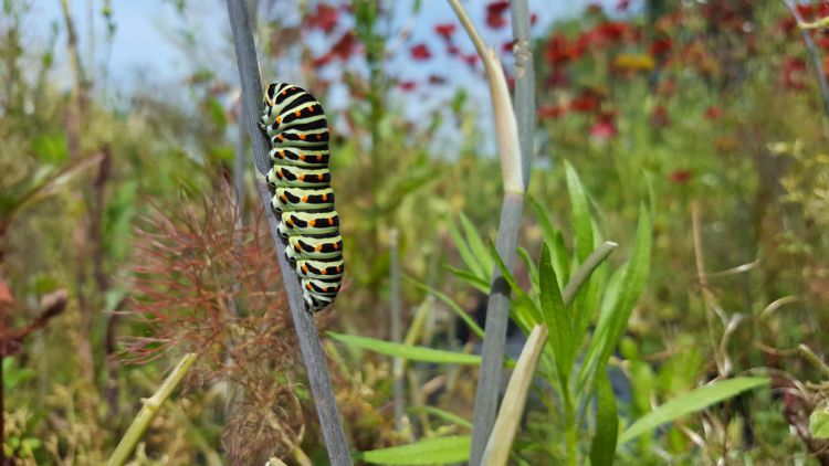 | De rups van de Koninginnenpage. De Koninginnenpage legt haar eitjes oa op de venkel. De venkel is een mooi voorbeeld van een niet-inheemse plant die ecologisch waarde heeft. |