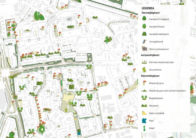 Een natuurkansenkaart is helemaal op maat op basis van onder meer data uit de Nationale Databank Flora en Fauna (NDFF), aangevuld met bestaand materiaal waarover je al beschikt en dat je met ons deelt. Denk aan beheerkaarten en andere kaarten met gegevens over bijvoorbeeld beheertypen en doelsoorten. We vullen al deze gegevens aan met onze eigen onderzoeksdata. Elke snipper tekenen we in: wat is er nu aan groen en valt daar natuurwinst te behalen? Zo ja, hoe dan? Bijvoorbeeld door bestaande vegetatie om te vormen, elementen als bomen en struiken toe te voegen of ander beheer toe te passen. Een stuk gazon met lage ecologische waarde heeft misschien potentie om bloemrijk gras- of bosplantsoen te worden. Of het daadwerkelijk omgevormd kan worden, hangt af van factoren als ligging en functie. Wordt het gazon als speelplek gebruikt of ligt het op een belangrijk zichtpunt qua verkeersveiligheid? We houden ook rekening met aanvullende wensen en kijken goed naar de situatie per locatie. Zijn er doelsoorten of biotopen die extra bescherming nodig hebben? Wil je hittestress verminderen op specifieke plekken? De kaart biedt plaats voor al deze onderwerpen. Door verschillende lagen aan en uit te zetten, zie je precies de informatie die je zoekt. En ook al zo handig: de kaarten werken in je bestaande kaartsysteem.