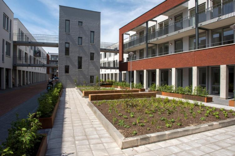 In opdracht van woningcorporatie Portaal verzorgde De Enk Groen & Golf de inrichting, met plantvakken, cortenstalen bakken en massief eikenhouten zitbanken. De beplanting is gerealiseerd volgens het Zorgeloos Groen-concept, wat volgens het bedrijf het hele jaar door 'een feest is voor het oog' is en bovendien onderhoudsarm.