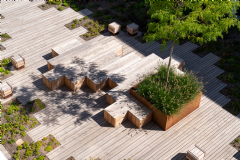 De tuin ligt op de begane grond, maar heeft door de ligging op het dak van de ondergrondse parkeergarage toch de kenmerken van een daktuin
