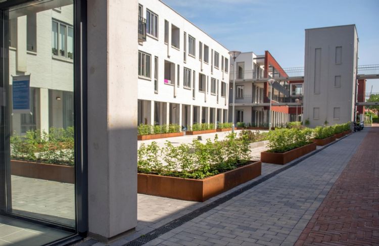 Van tuincentrum naar appartementencomplex, inclusief groene binnentuin met 70 meter cortenstalen plantenbakken |