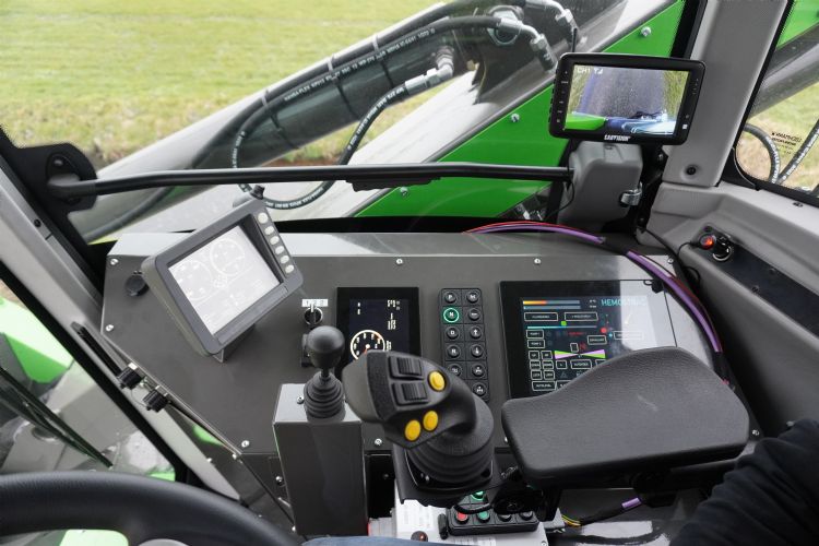 Ongetwijfeld heeft de Duitse machinist een zeer comfortabele werkplek. De cabine heeft veel glas en rondom ruitenwissers. Standaard is de cabine voorzien van airconditioning, verwarming, een koelkastje en een radio. De cabine is op een grote, geveerde draaikrans gemonteerd en is 180 graden rechtsom hydraulisch draaibaar. Hierdoor kan de chauffeur de juiste hoek kiezen voor optimaal zicht op het werk. De draaikolom van de Hemos-giek is voor de cabine geplaatst. Dankzij de 1,6 meter zijverstelling van de hydraulische giek kan de chauffeur perfect dicht op of half in de berm werken, waardoor het andere verkeer veel minder gehinderd wordt. De chauffeur heeft kruishendels in de rechterarmleuningen van de bestuurdersstoel tot zijn beschikking om de Parker L90 hydraulische ventielen te bedienen. Een tweede joystick is optioneel. Verder heeft hij drie screens tot zijn beschikking om de machine onder controle te houden: de Parker IQAN met touchscreens voor de DAF-motor, de Hemos-bediening en de bediening van de VDS-varioversnellingsbak.