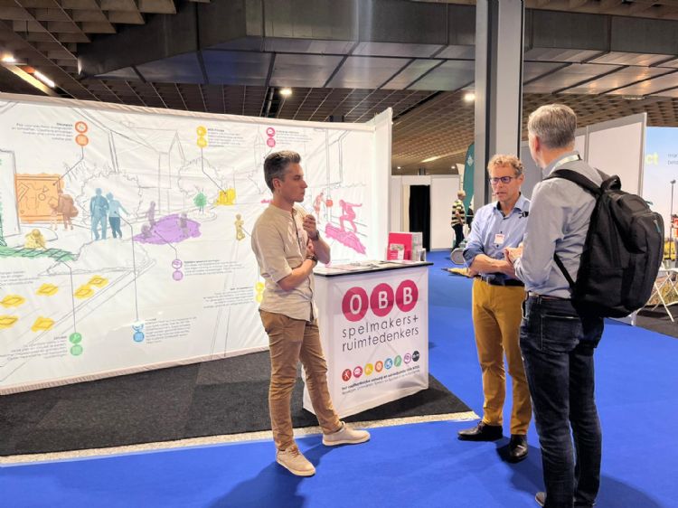 Arjan Vreugdenhil en Johan Oost van OBB spelmakers + ruimtedenkers informeren bezoekers over de integratie van spelen in de openbare ruimte voor alle leeftijden. Vreugdenhil: 'Een goede stad heeft geen speelplekken nodig.'