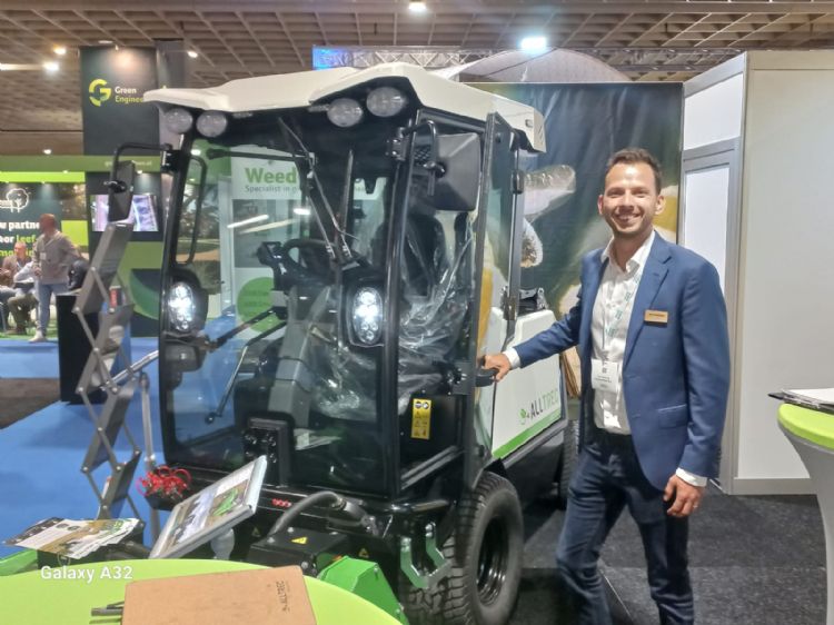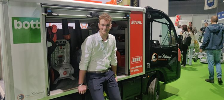 Tijdens de beurs de introductie van de samenwerking tussen van Blitterswijk, Stihl en Bott. Floris Harkes van Van Blitterswijk eco-mobiliteit zit in een volledig elektrische Goupil compleet ingericht met de producten van Stihl en Bott. Harkes: 'Een mooie oplossing voor de zero-emissie zones van het stedelijk gebied voor groenmedewerkers maar ook bijvoorbeeld infra of afval.