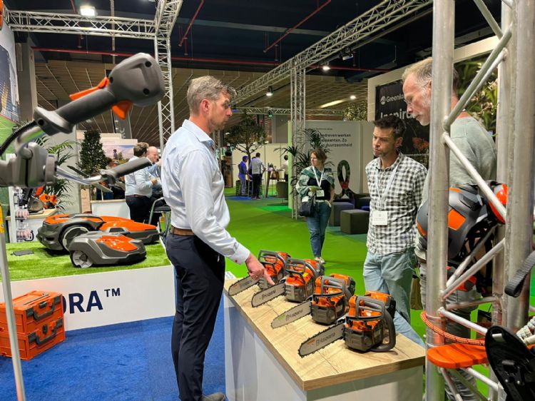 Op de stand van Husqvarna laat de gemeente De Fryske Marren zich voorlichten door Paul Miltenburg over de nieuwe generatie Husqvarna kettingzagen.