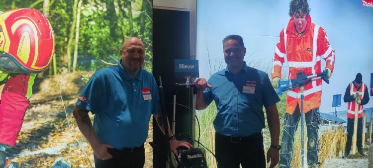 Nieuwste van het nieuwste op de Vakbeurs Openbare Ruimte bij Makita zoals de 40v XGT hogedrukreiniger. Op de foto Arjen Peeters en Ruud Steenbakkers.